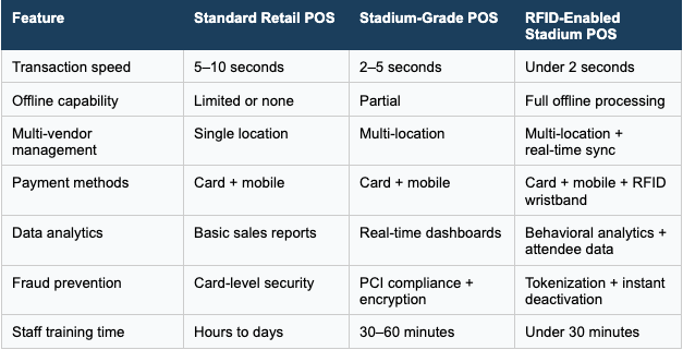 - Standard retail POS platforms are not built for the transaction spike environment of a stadium; venues need systems purpose-built for compressed, high-volume service windows.