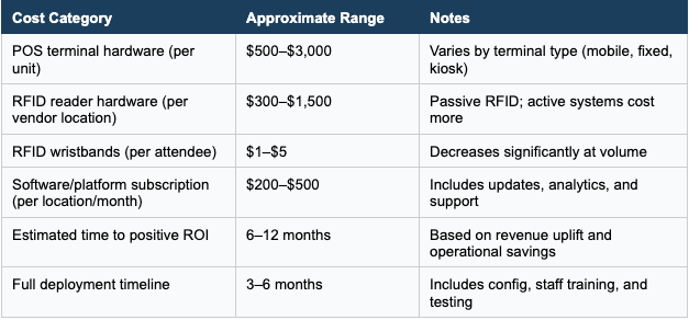 Payment terminal hardware ranges from several hundred to several thousand dollars per unit depending on capability level, with mobile, fixed, and self-service kiosk units each at different price points. RFID infrastructure adds reader hardware and per-event wristband costs that vary by order volume and customization. Industry experience with stadium POS systems puts initial setup in the range of $500 to $2,000 per POS location, with ongoing subscription and processing fees of $200 to $500 per location monthly, and most deployments reaching positive ROI within six to twelve months through increased revenue and reduced operational costs.